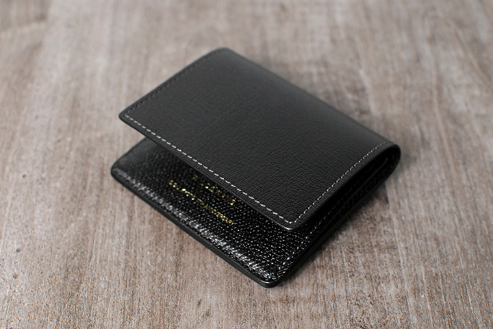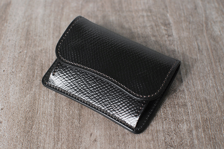 こちらも型押し加工を施したベルギー牛革のサドルプルアップを用いています。LACONICはカード、コイン、紙幣がまとめて収納できるスマートなミニウォレットです。こちらもブラックのみのご用意となります。 ※製品のより詳しいご案内はこちらのブログをご覧ください。