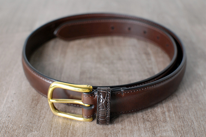 こちらはベルギー牛革のサドルプルアップをベースにして製作したBELGIANですが、サル革部分にクロコダイルを用いた特別仕様のベルトに仕上げています。サイズは90㎝、カラーはチョコのみのご用意となります。
