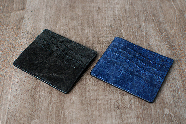 最後にご紹介させて頂く限定のお品物は、シューメイカーの福田洋平氏とドメスティックブランド・CORBOのチーフデザイナー・古瀬聡氏とWILDSWANSの3社コラボレーションのより誕生したカードケースです。貴重なエレファントレザーを合わせることで、スマートな中にもどこか野性味を感じさせるアイテムとなりました。カラーはブラックとインディゴブルーの2色でご用意しています。