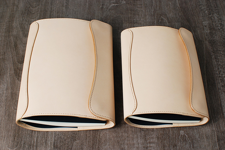 OWLのB6サイズバージョンです。画像左が先にご紹介したA5、画像右がB6です。サイズ以外の仕様はA5と全く同じです。内装にはペンホルダーが付属されているので、ペンを装着していれば本体を開いて直ぐにノートの使用が可能です。また、本体の向きを180度変えることで右利き、左利きどちらの方でもストレスなくご使用頂けます。こちらもカラーはナチュラルのみのご用意です。