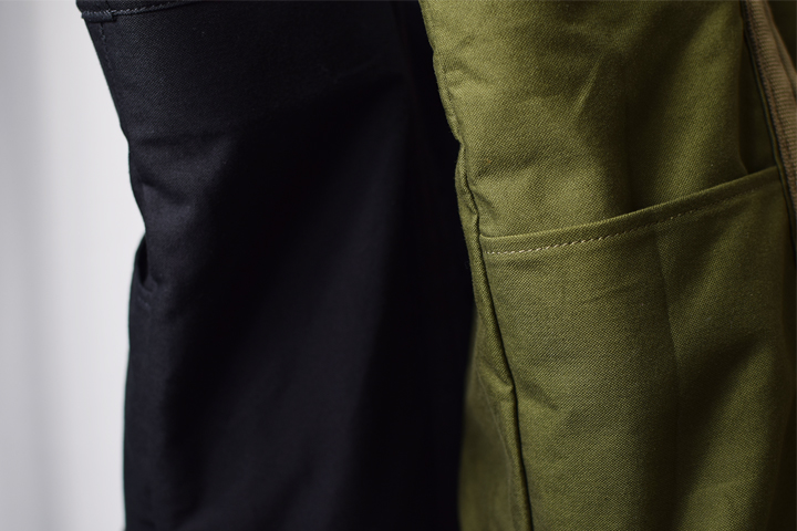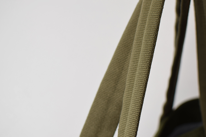 WILDSWANSでは初製作となるエコバッグのBRICKLANEは、これまで革をメイン素材としてWILDSWANSが製作してきた鞄のイメージとは全く異なる趣です。薄く軽いナイロン素材のエコバッグは携帯性には優れているものの、中には耐久性が低いものがあり、収納した牛乳パックの角と干渉した箇所が破損してしまうケースもあります。そこでWILDSWANSではエコバッグ本来の役割を再度見直しました。今回製作したBRICKLANEでは外装に丈夫な11号帆布を用いています。手触りが良い11号帆布は、見た目以上に軽量で優れた素材です。