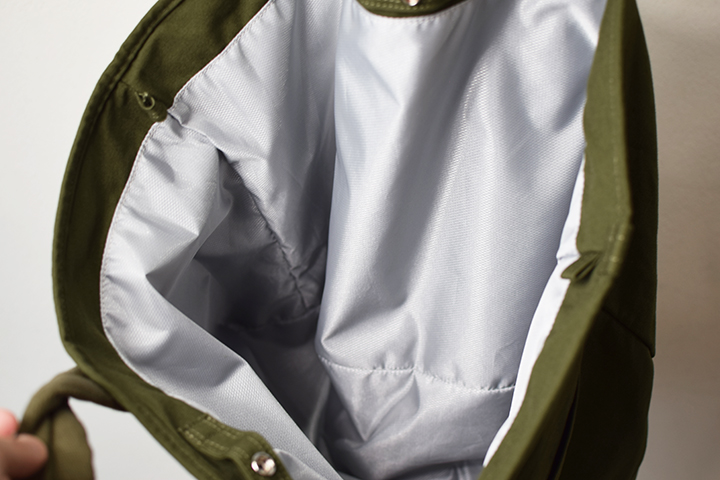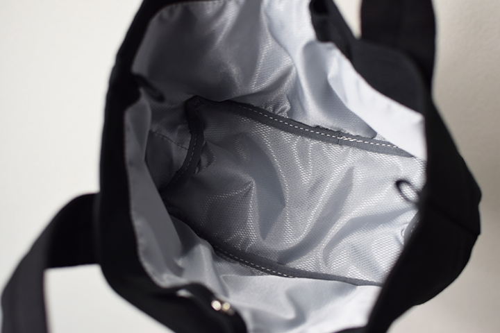 内装素材はLサイズと同じ撥水加工を施したポリエステル生地です。ちょっとコンビニでデリなどを購入する際に重宝します。