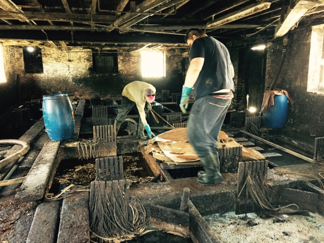 ベイカー社ではオーク樹皮から抽出したタンニン溶液を用い、濃度の異なるタンニン槽に段階的に移し替えながら通算12ヶ月以上もの期間を費やしてじっくりと鞣しを行っています。