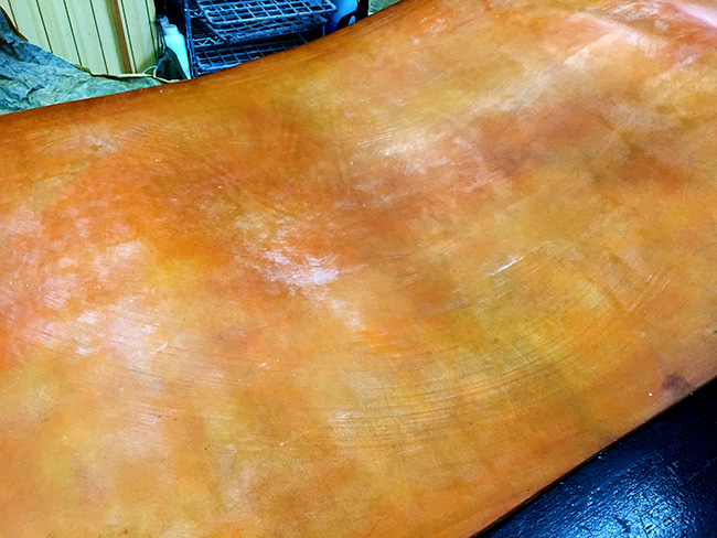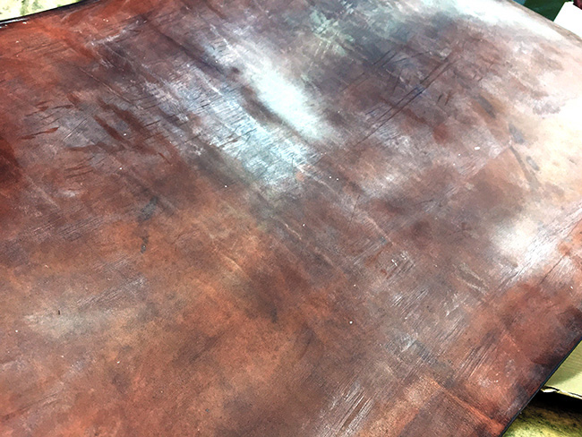 出来上がった無染色のナチュラル状態の革に、染色とワックス(蜜ロウ、タロウ、植物性油等)を塗り込む作業を行います。