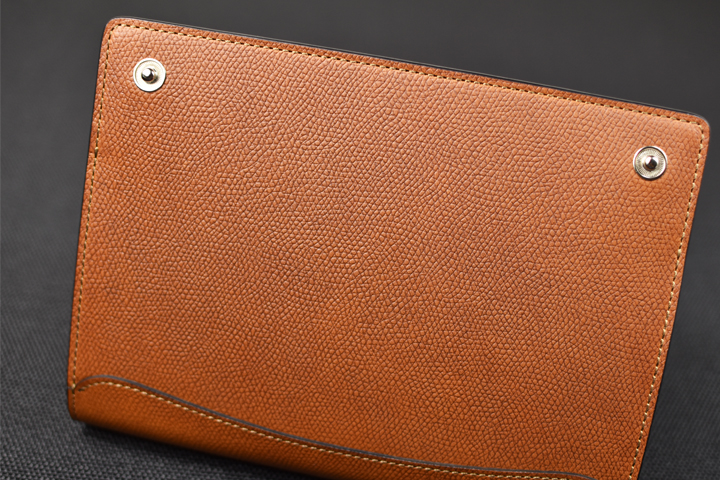 フラップ部分は留め具を設けておらず、余計なものを削ぎ落した外観はスマートで皮革の質感や表情がより強調されるようです。 お使い始めから暫くは皮革のハリによってフラップは開いたままですが、革が馴染むことによって徐々に閉じて参ります。