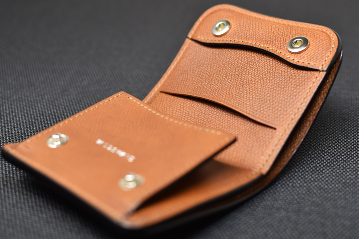 TONGUEのフラップは左右2点のホックで留められており、開くと内装のコインケースが現れます。 コインケースは左右にマチが設けられた開閉しやすい造りで、中身の視認性と取り出しやすさに優れています。