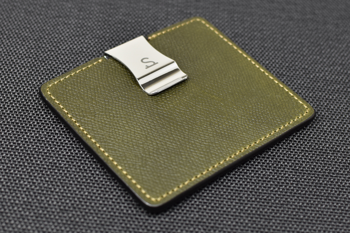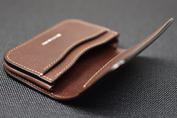 こちらがMINIMALの表面です。 表面にはクリップ金具が取り付けられており、カードや折り畳んだ紙幣などを挟み込んで収納することが出来ます。