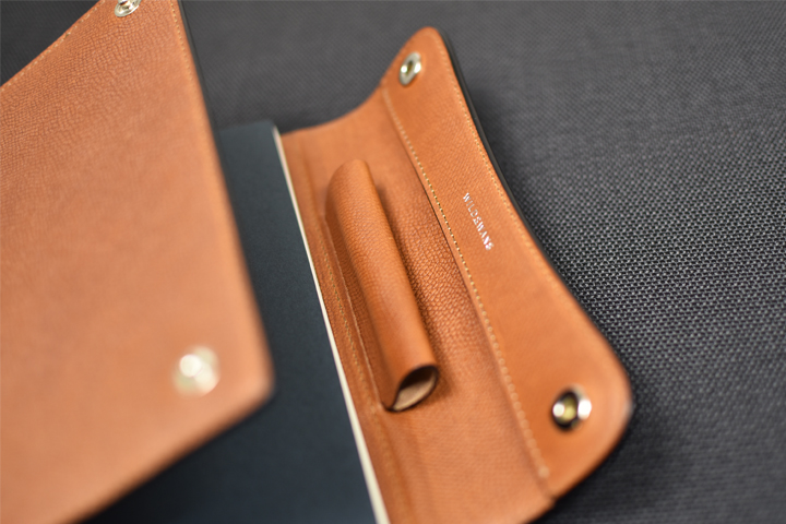 フラップの裏側にはペンホルダーが付属します。 ペリカンのM800位までの太さのペンに対応しており、ノートと一緒に持ち運ぶことが出来ます。