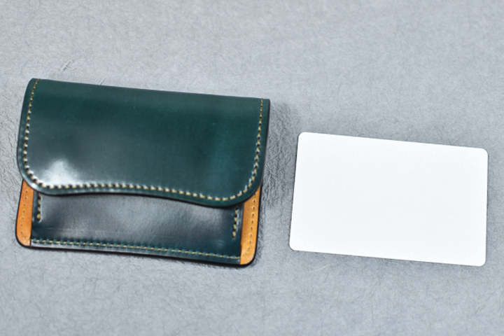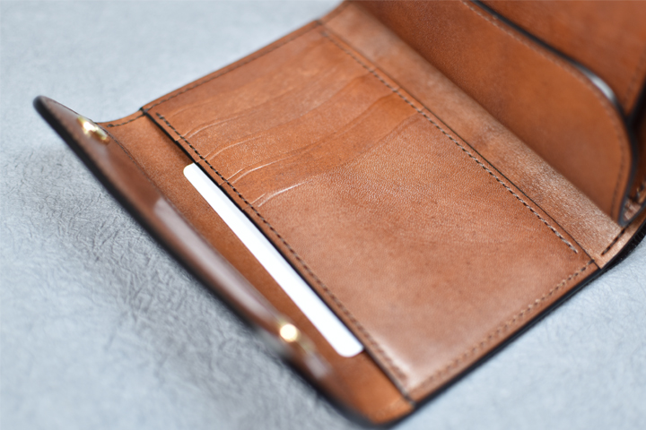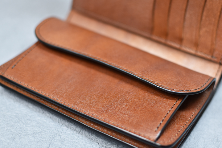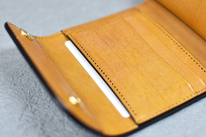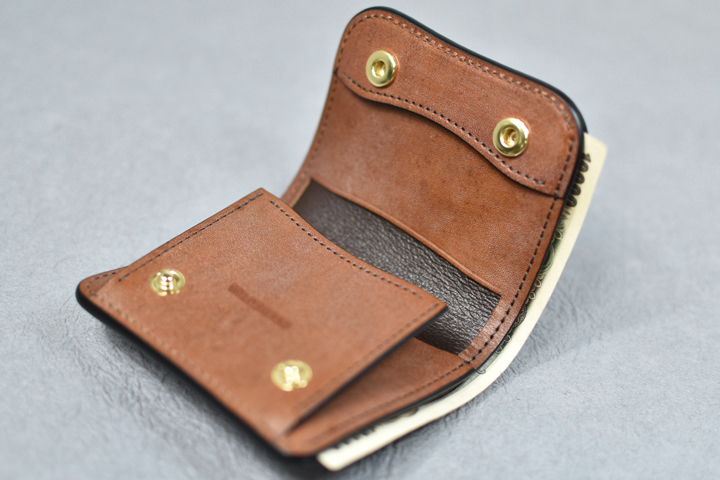 本当に丁度一万円札が収まるサイズのため、今回のようにハリの強い素材で製作された場合には初め少し窮屈に感じられることがありますが、程なく皮革が馴染むことで難なく収納できるようになります。