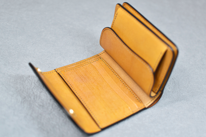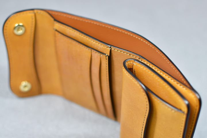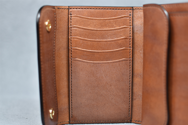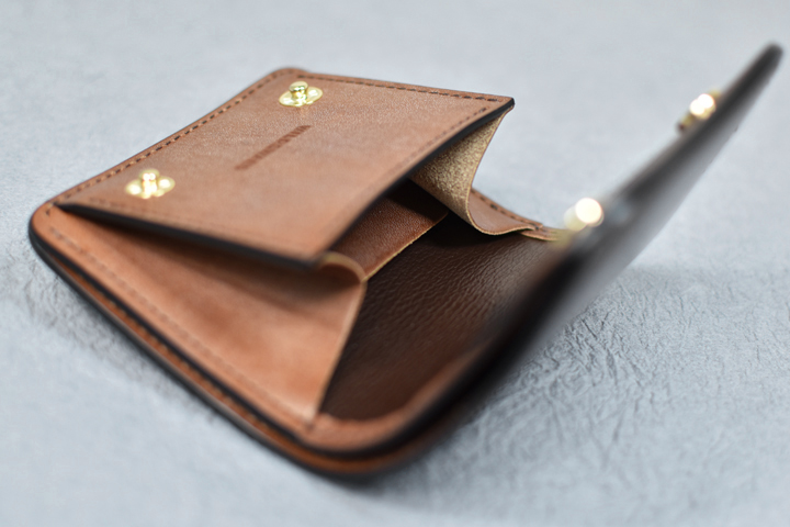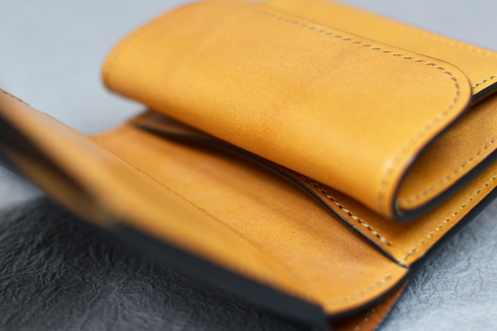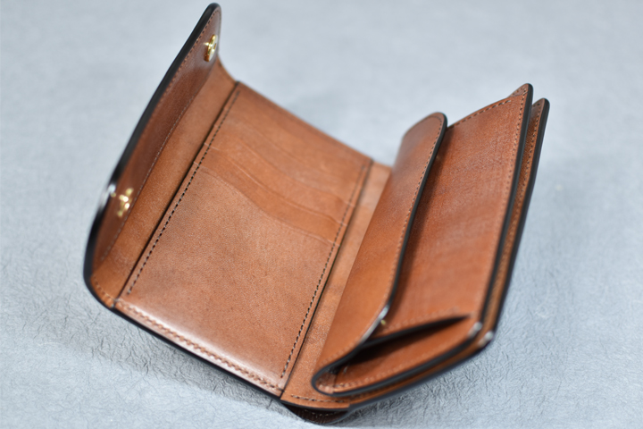 収納部のユニットを革で包み込んだ3つ折り財布、何層にも重なるパーツのコバが印象的なモデルです。