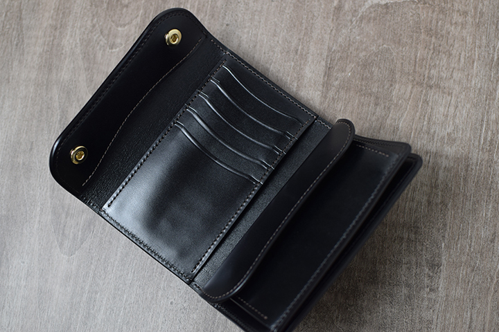 長財布以下、二つ折り財布以上のスペックを備えたBYRNEは、サドルプルアップを贅沢に用いた頼もしい重量感を感じさせるアイテムです。