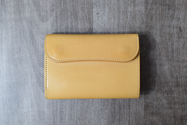 そのエイジングにも目を見張るものがあり、使用することで少しずつ表面はあめ色に変化して芳醇な光沢が現れます。ちなみにこちらの画像はスタッフが約1年半使用したサドルプルアップのナチュラルを用いた三つ折り財布・BYRNEのエイジングサンプルです。
