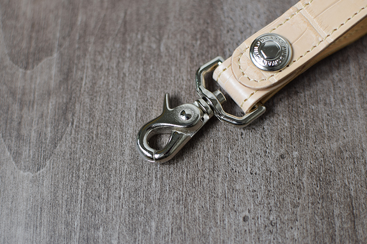 帯に付属されたもう一方の金具はナスカンパーツとなります。レバーにより開閉を行うパーツですが、ベルトループや鞄のリングなどに装着が可能です。このナスカンパーツは動きに合わせてくるくると回転するため製品全体へ負荷がかかりにくくなっています。