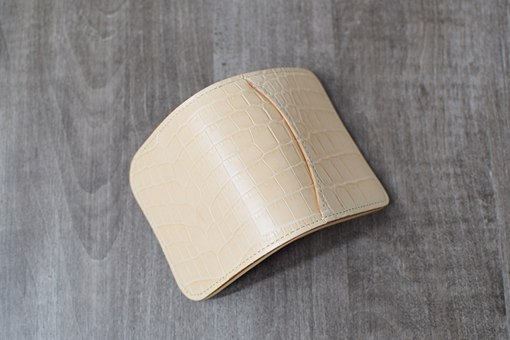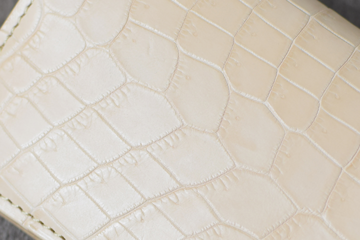 エキゾチックレザーの代表格であるクロコダイルは、WILDSWANSにおいて近年人気が急上昇している皮革の一つです。現在、WILDSWANSではブラックとチョコの2色のカラーを定番カラーとしてクロコダイルシリーズを展開していますが、今回、極めて珍しいナチュラルカラーのクロコダイルを入手することができましたので、少量ではありますがこちらを用いた革小物を製作させて頂きました。