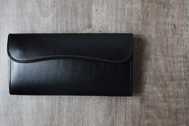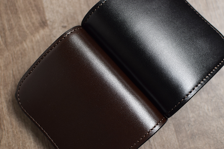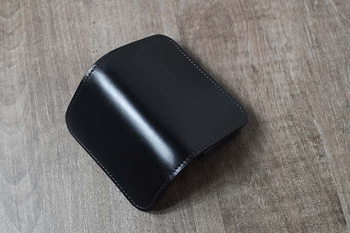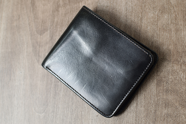 先ずはブラック。こちらは2年半程使用した二つ折り財布・サドルプルアップGROUNDER/ブラックのエイジングサンプルです。ブラックについては、色味の変化こそないものの透明感の強い光沢が皮革表面を覆っています。