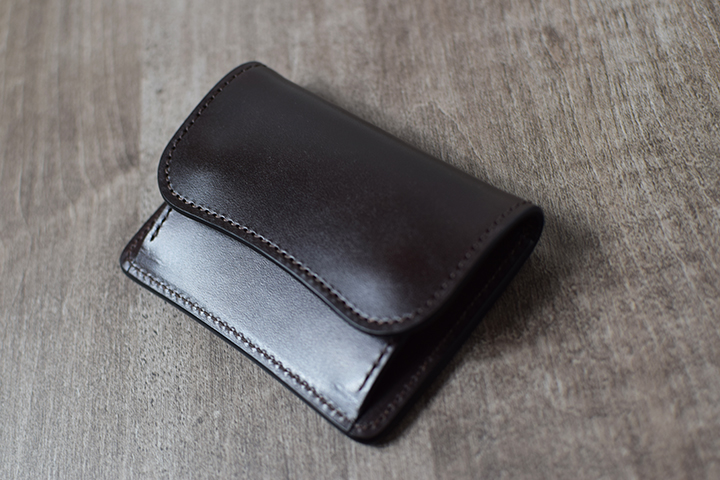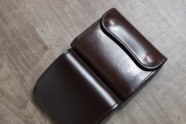 続いてチョコです。エイジングサンプルは、3年程使用した小型三つ折り財布・サドルプルアップENO/チョコです。こちらも皮革表面にはっきりとわかる光沢が現れています。