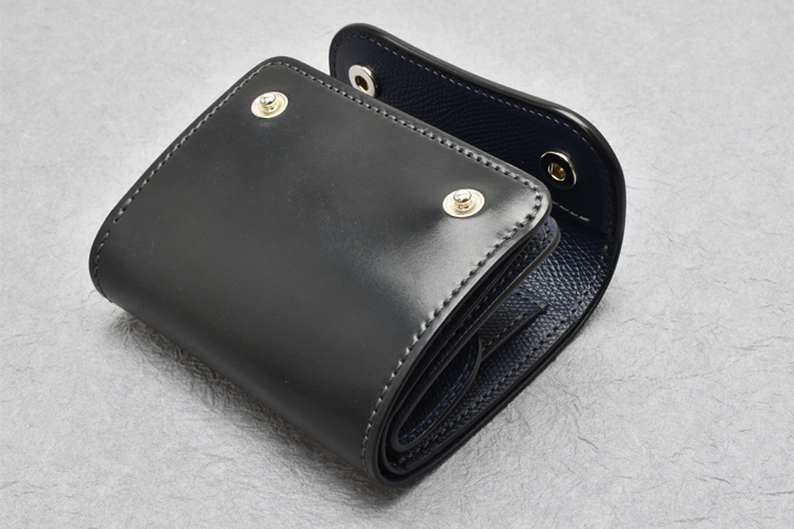 外装のフラップと本体の前胴部分を2点のホックで留めることで3つ折りに固定されます。 特に使い始めは皮革のハリが強くコロコロと丸みを帯びた形状のため、どことなく愛嬌のある形状もENOの特徴の一つです。