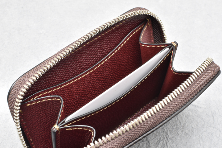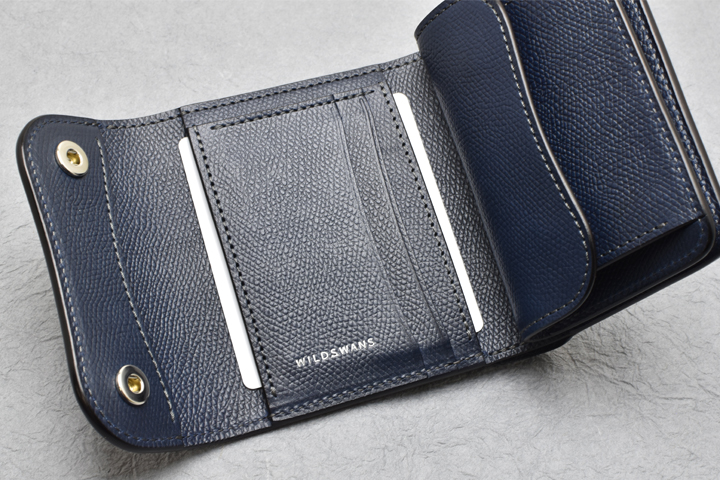 内装は小型の三つ折り財布ならではの形状で、収納部によって縦向き、横向きと2種類の方向へ配置されています。
