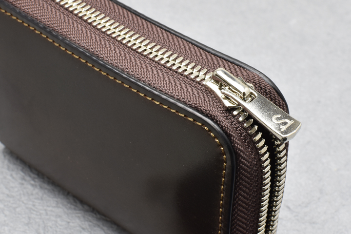 本体の外周に使用されているのはYKK社のエクセラファスナー(5番)です。 エレメント(務歯)の一つずつを丁寧に磨き上げて仕上げられたエクセラファスナーは、バリや歪みなどによる引っ掛かりを感じることなく、非常に滑らかな引き心地が特徴のファスナーです。