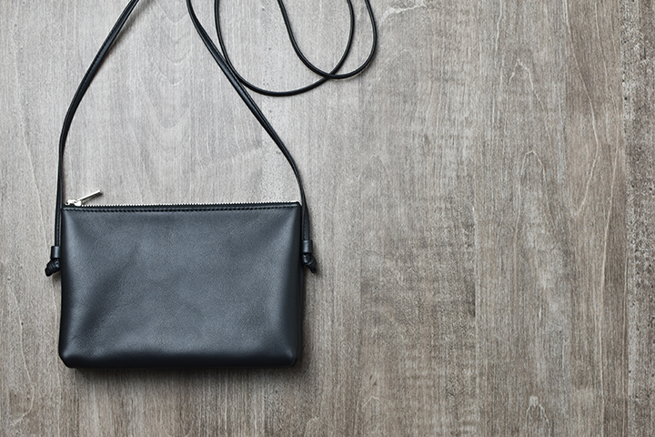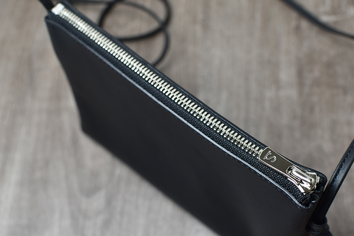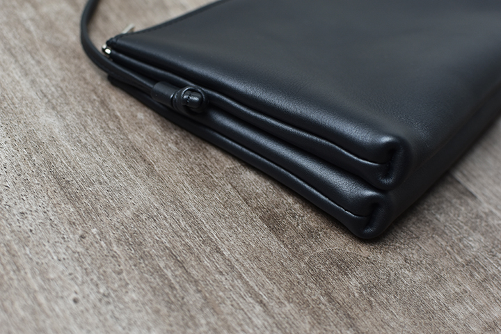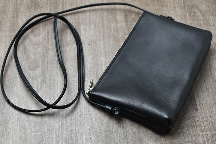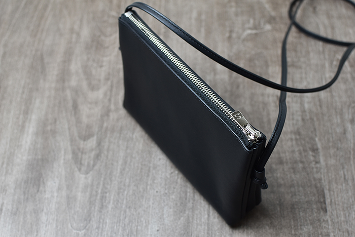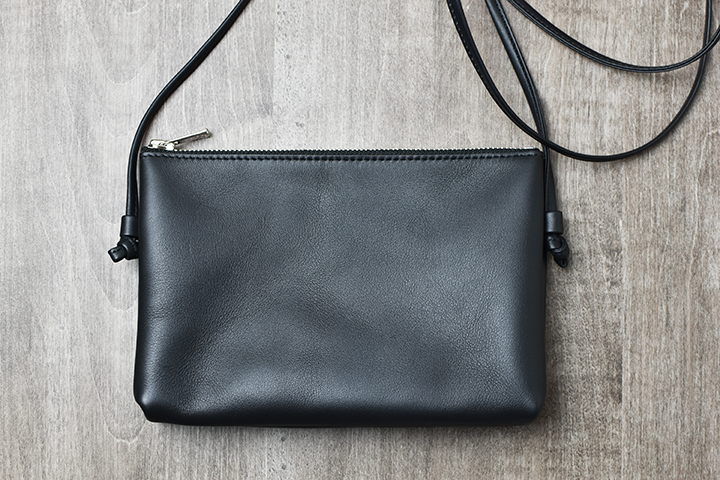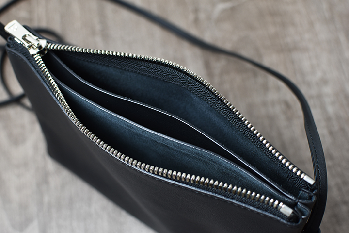 こうしたマチの構造により、小振りなサコッシュバッグながら本体をデスクなどに立てて置くことができます。