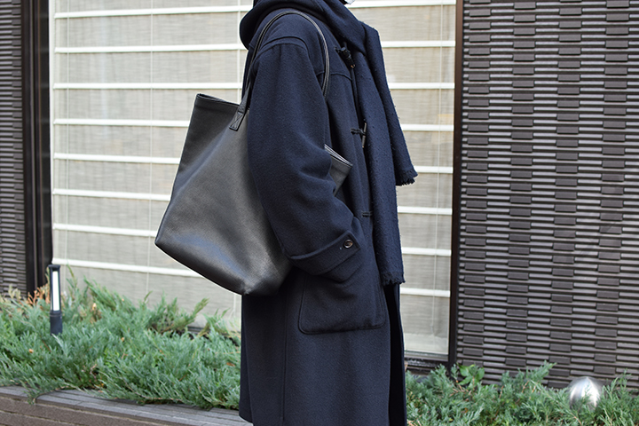 しかしながらモンパルナスカーフは、使用すると皮革表面に程よい艶が現れ、その質感自体も使用前よりも更にもっちりとした心地良い手触りに変化する驚くべき皮革です。こちらの画像でご紹介しているのが、実際にスタッフが使用したモンパルナスカーフを用いたトートバッグ・LIBEROのエイジングサンプルです。