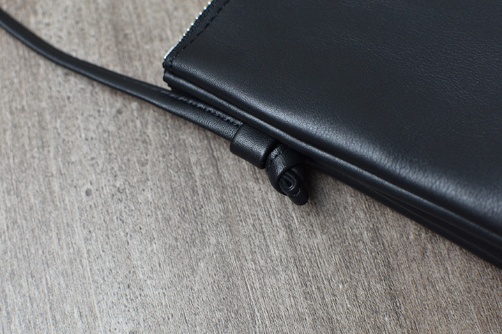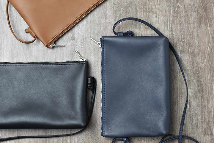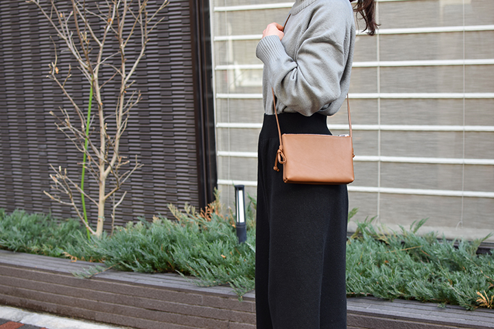 ショルダーストラップの長さは、結び目を付けてお好みの長さに調整します。このあたりも極力金具を使わないことで全体的に美しくミニマルなデザインに仕上げています。