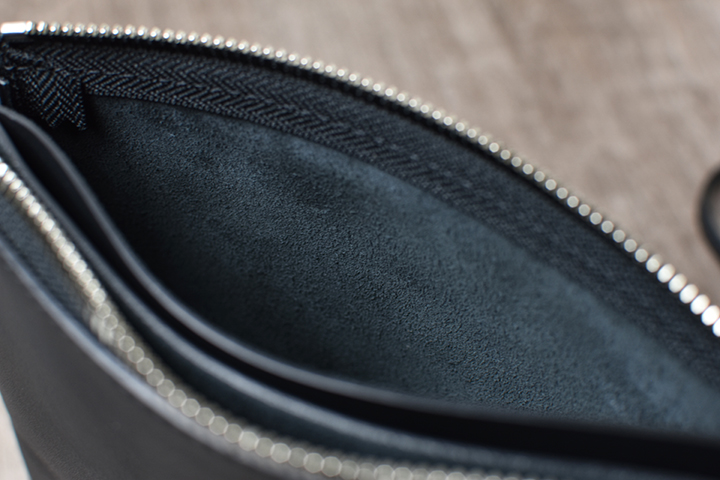 ショルダーストラップも本体と同じモンパルナスカーフが使われています。他のWILDSWANS製品に付属するショルダーストラップに比べると細身の仕様となりますが、指で触れるとモンパルナスカーフならではのもっちりとした心地よい質感が確認できます。
