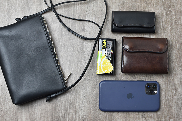 収納量を確かめるために実際にスタッフがLUMIEREの中にいろいろなアイテムを収納してみました。小型三つ折り財布・ENO、キーケース・CLIPPERⅡ、スマートフォンを収納できました。どれも小型のアイテムではありますが、比較的厚みのあるアイテムを収納していることから、LUMIEREの収納力の高さを垣間見ることができます。
