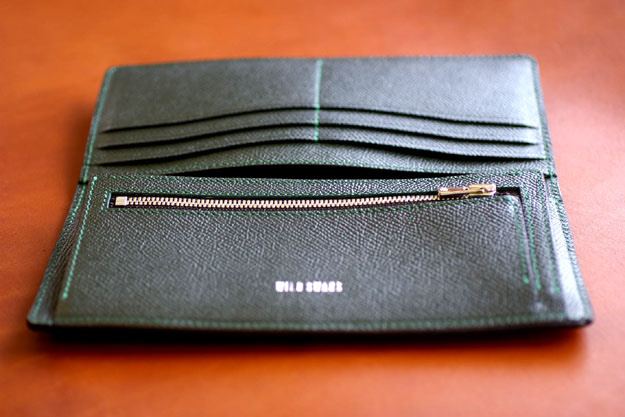 上の写真は、左からグリーン、ブルー、ワインの長財布です。他の色バリエーションとしてはブラック、チョコレートがあります。