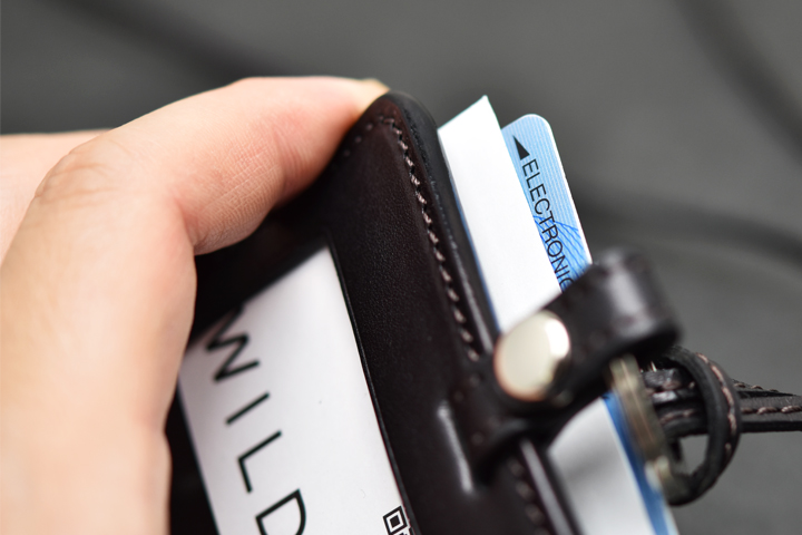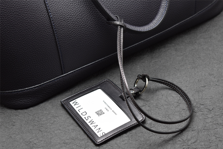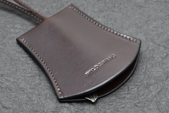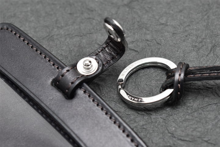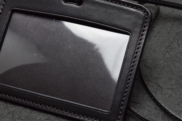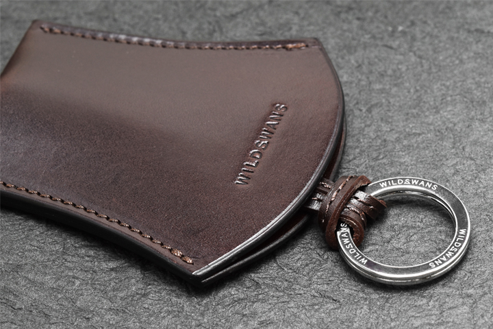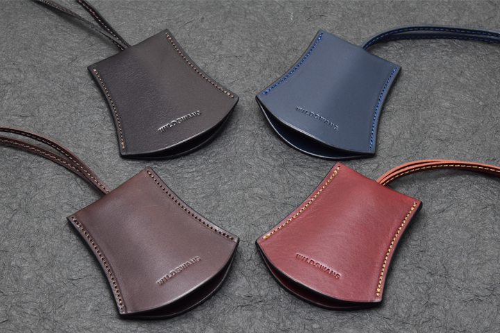 首から掛けて使用するため、移染を可能な限り防ぐ目的でコバ部分は通常のWILDSWANSの革小物に用いられる染料仕上げではなく、顔料仕上げにて製作されています。