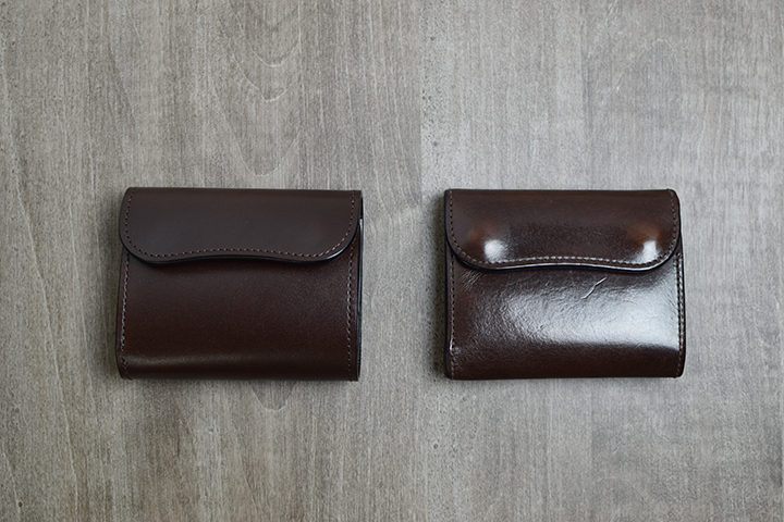 次にENO自体のかたち変化については、こちらの画像をご覧ください。こちらも画像左が使用前、画像右が使用後のサドルプルアップENO/チョコです。使用前のボリュームは落ち着いて、ずいぶんすっきりとしたかたちに変化しました。しかしながら、サドルプルアップ自体の革のハリ感は全く損なわれることはありません。サドルプルアップは本当に頼もしい革です。ちなみに現行のサドルプルアップENOは、数年前の仕様変更により3年もののENOに比べてフラップの長さが若干長くなっています。