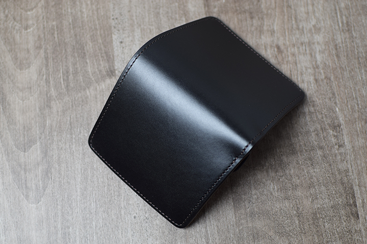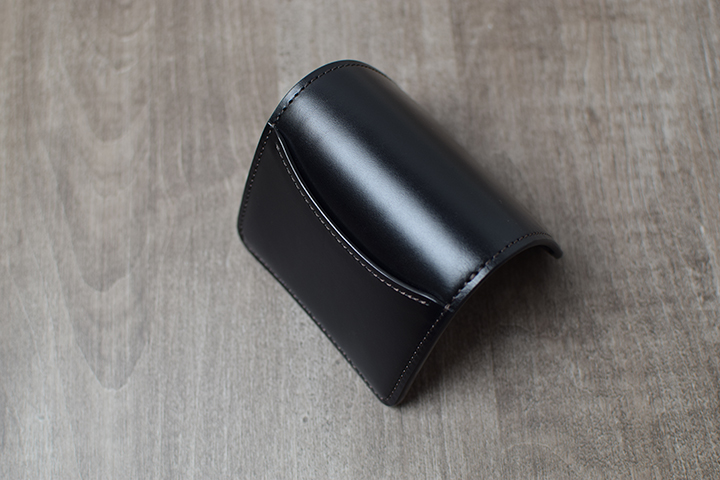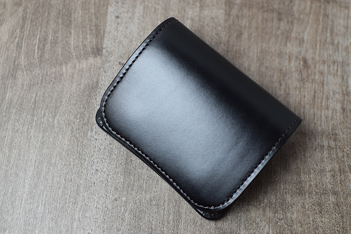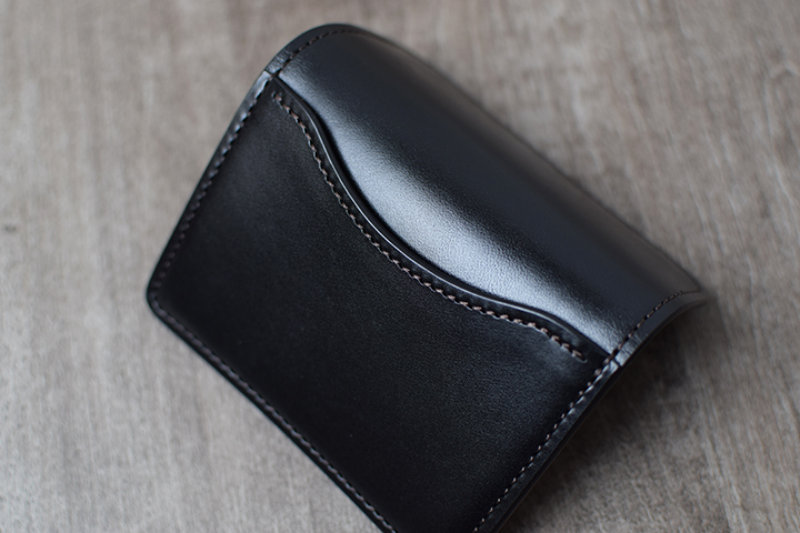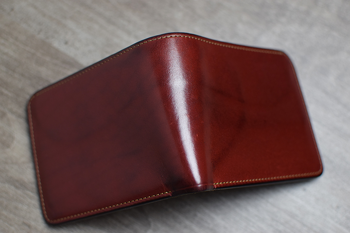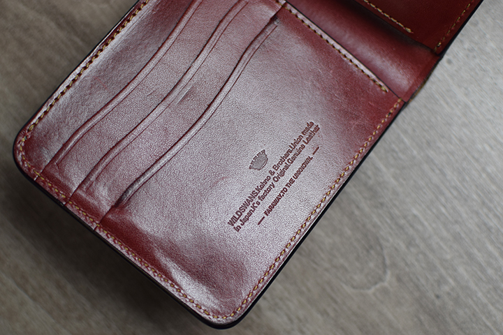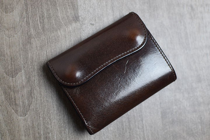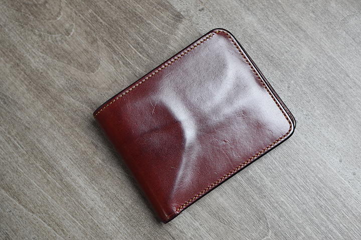 手にした際に一番驚かされたのは、サドルプルアップの肉厚で硬い、ハリの強い質感でした。しかも、ただ硬いだけではなく程よい柔軟性もあって、財布を少し曲げるだけで、「ギュウ、ギュウ」独特の音を奏でていました。これは頼もしい財布だと思い、購入をして今に至るわけですが、実質使用期間3年で表面に豊かな光沢が現れ、色味も2トーン程濃く変化しています。