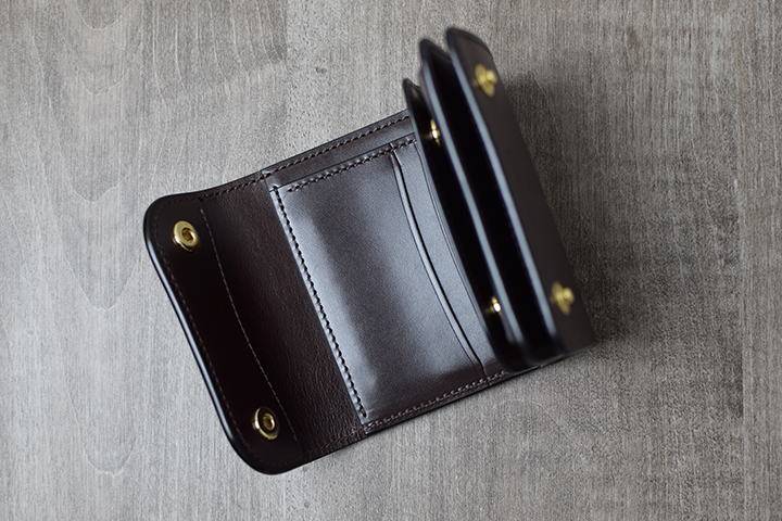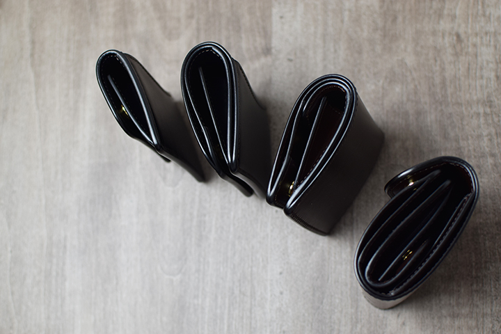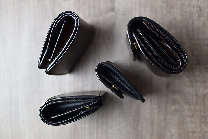 ご紹介させて頂いた上記3モデルよりもやや大きく、厚みもありますが、三つ折り財布の構造を最適化したことにより、ストレスなくお使い頂けるウォレットに仕上げています。