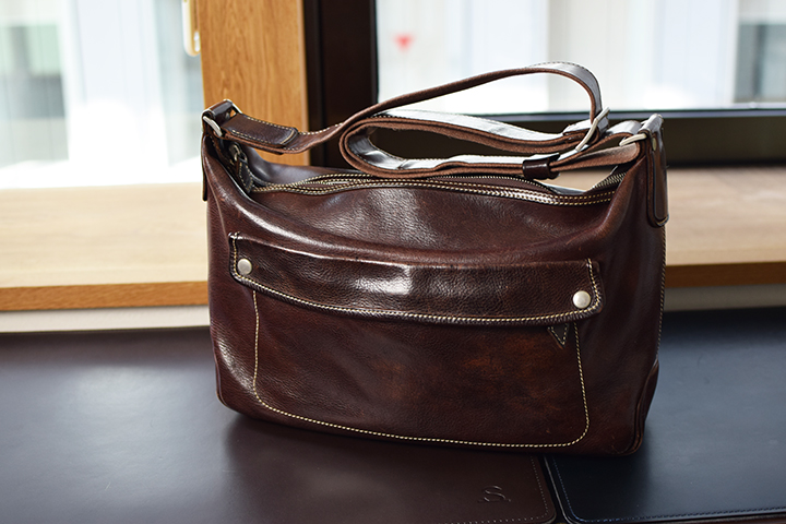 このシボ加工により、皮革表面にキズが入っても目立ちにくく、仮にキズが入ったとしても、ミネルバボックスの皮革内部の豊富な油分により、比較的薄いキズであればブラシ等で革を磨く、あるいは手で揉み込むなどして、キズについてはある程度修復することができます。さらに皮革表面に一定程度の艶が現れるとこの油分の膜により、水分や汚れなどによるシミもある程度防ぐことが可能です。ミネルバボックス自体、比較的柔らかい質感ですが、肉厚で弾力性もあり非常に高い耐久性を備えています。こうした皮革の特性から見てもミネルバボックスが如何に鞄作りに適した素材であるかがわかります。