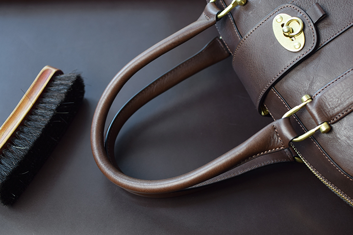 また、より強度を上げるためにハンドルと本体を接続するハンドル根革にも厚みのあるミネルバボックスをあしらっています。さらにハンドルと根革の間に、真鍮金具のDカンを組み合わせることで、ハンドルとバッグ本体にかかるストレスを解消しています。