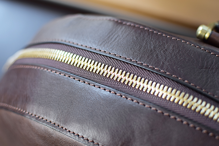本体の両側側面下部には革の持ち手パーツを備えているので、ファスナーを閉じる際に片手でこちらを持ちながら、ファスナーを閉めることでスムーズな操作が可能となります。