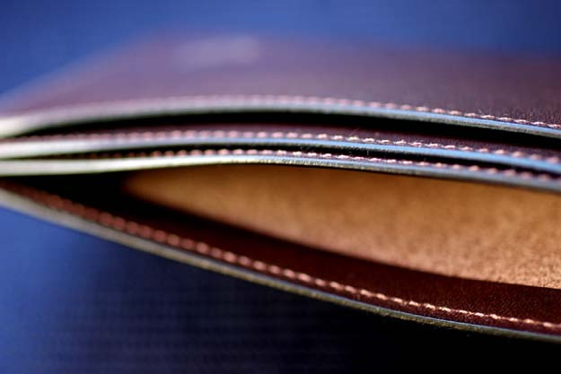 この札入れはボリュームを落とす為にマチを設けませんでしたが、部屋は3室構造になっていて、実は見た目以上の容量があります。(容量については次回、触れたいと思います。)