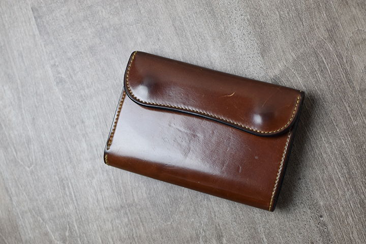 シェルコードバンは、皮革の表面が非常に細かな繊維の集積から成ることから、実際に使用する上ではキズが付きやすく、汗や水分にも弱いという一面があります。しかしながら、曲げ伸ばしや引き裂きには強く、皮革自体の耐久性においては優れた皮革であることには変わりありません。お手入れは、ブラッシングと柔らかい布を使用した乾拭きが基本です。専用のクリームが様々な種類で販売されていますが、財布などは革靴と比べて、外に晒す機会が少ないため、またシェルコードバン自体に油分が多く含まれることから、頻繁に皮革用クリームを必要としない皮革となります。皮革用クリームを過度に入れ過ぎた場合、シェルコードバン特有の光沢が、現れなくなる恐れもあるため注意が必要です。