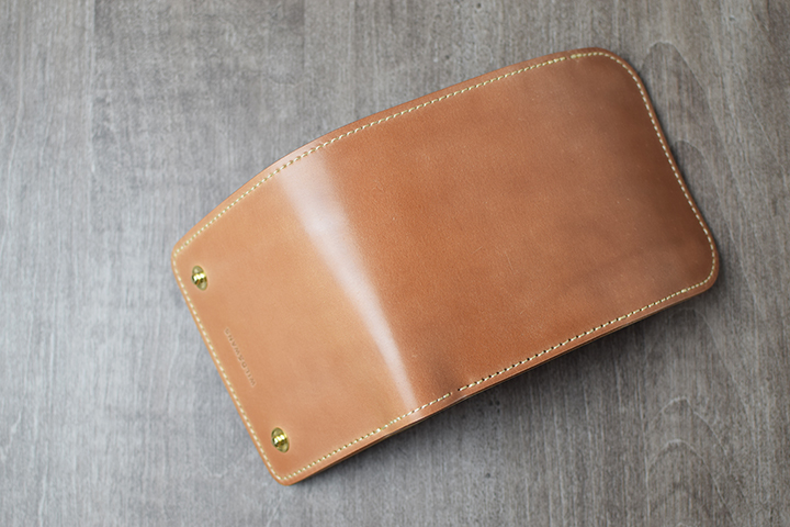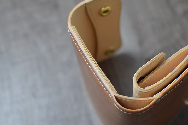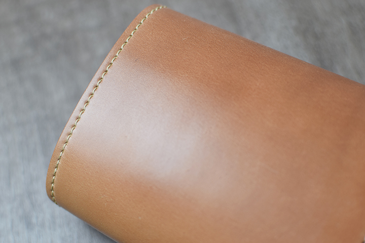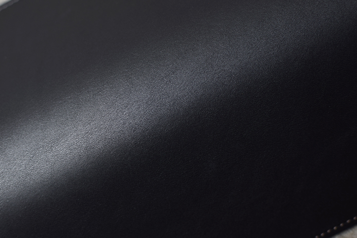 コバ(革の断面、製品の縁)の仕上げは、黒の染料仕上げです。こちらにより、アイテムがグッと引き締まった印象となります。