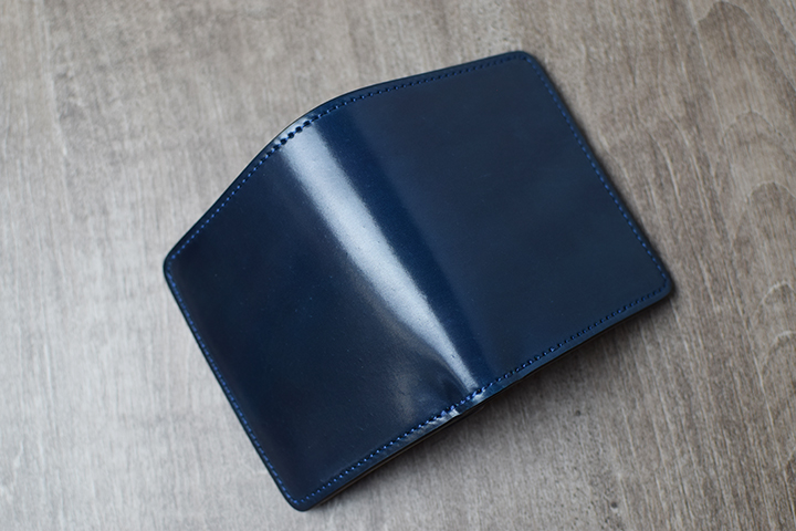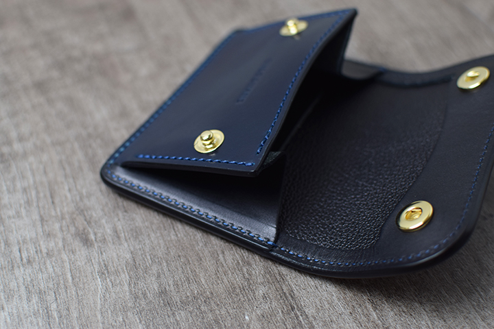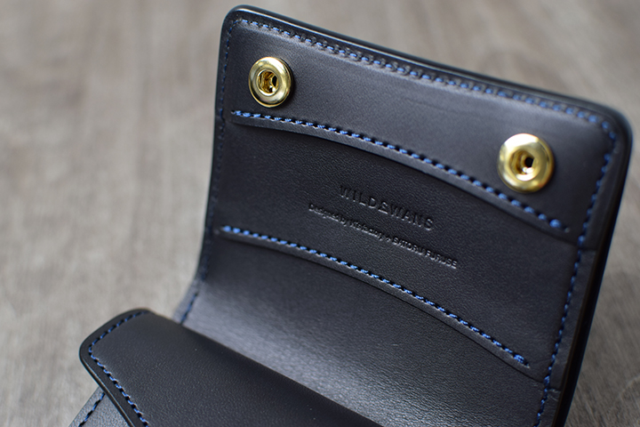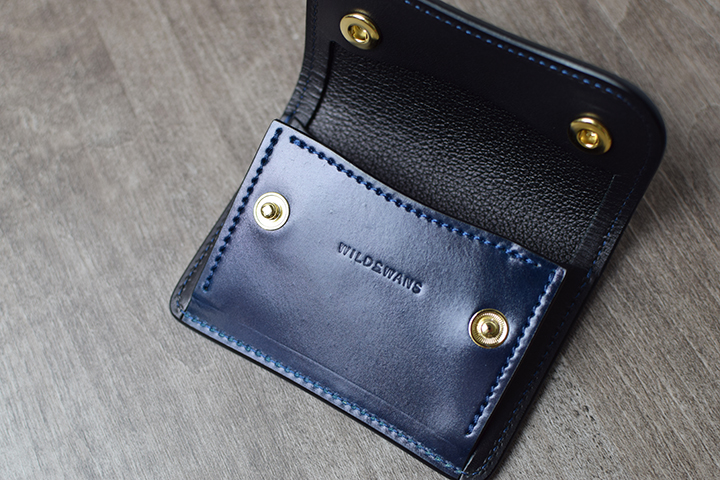 インテンスブルーの内装にはアメリカ牛革のイングリッシュブライドルレザーのブラックを組み合わせています。イングリッシュブライドルレザーは、近年WILDSWANSが取り扱う皮革の中で最も注目を集めている皮革の一つです。同じブライドルレザーのフルグレインブライドルレザーに比べてしなやかな質感ですが、フルグレインブライドルレザーと同様に肉厚でとても丈夫な皮革です。また、イングリッシュブライドルレザーは、シェルコードバンに勝るとも劣らない美しいエイジングを遂げる皮革でもあります。