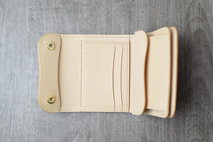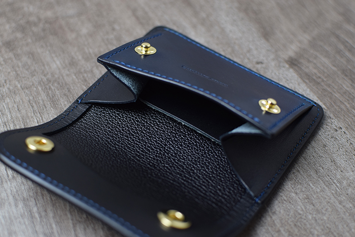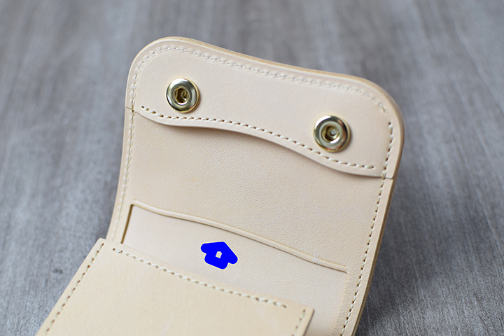 コインケースは、kf-003と同様にコインケース自体にフラップが付きます。内部には他のアイテムと同じく「ベロパーツ」が付属されます。カード段に収まりきらないカードは、こちらにも収納できます。