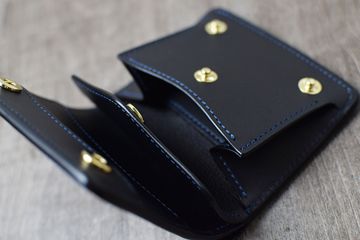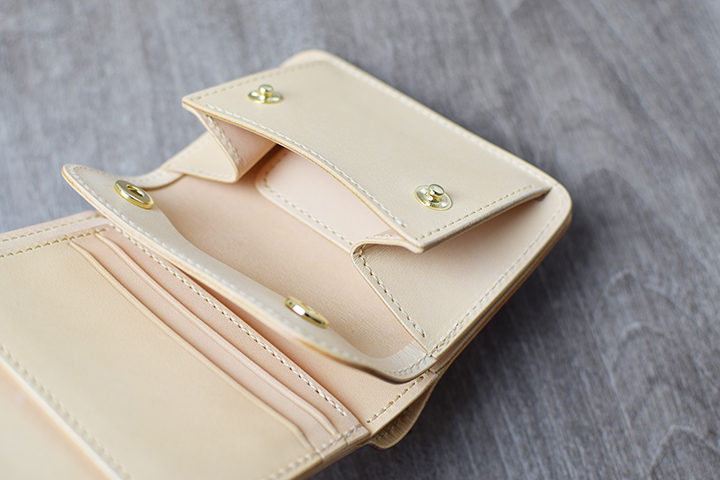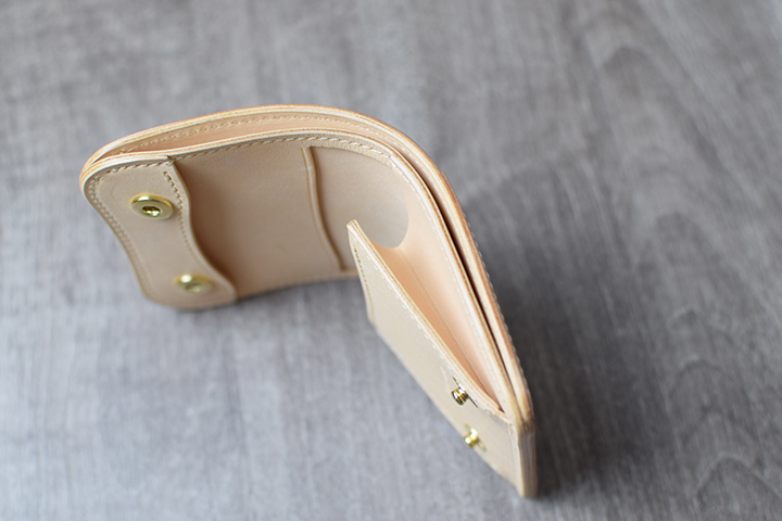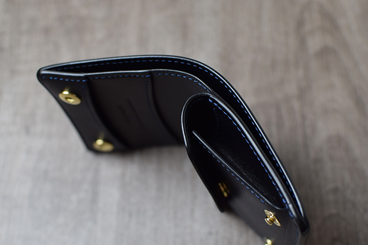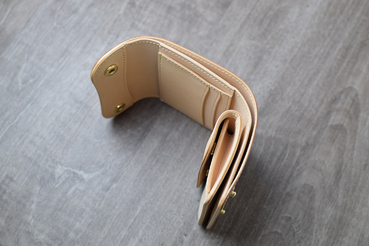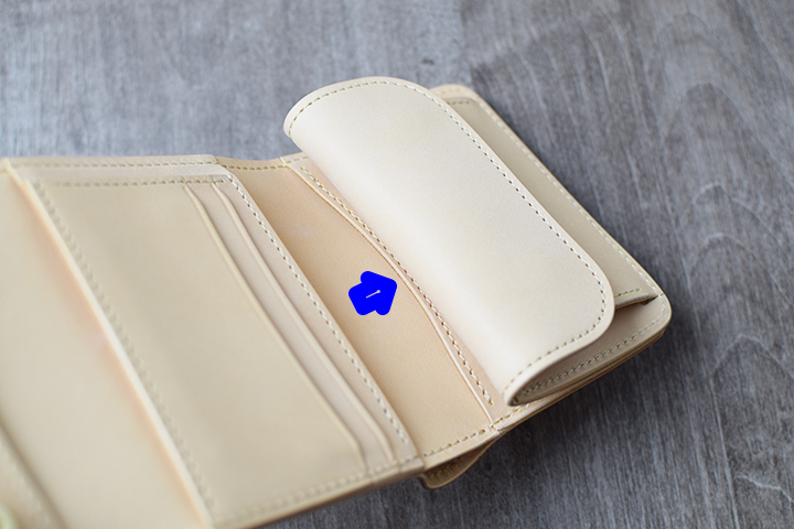 コインケース内部には革の仕切りを備えています。仕切りの手前にコイン、奥にカードや折りたたんだ紙幣の収納が可能です。
