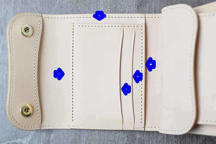 フラップ裏のスペースはカード等入れる際、力の加減により入り口部分の革が裂ける可能性がございますので、こちらのスペースにはカード等を入れないようご注意ください。