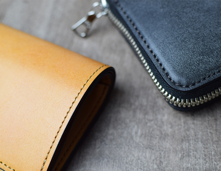 まずはこのどっしりとした風貌をご覧ください。外装は、切れ目のないフルグレインブライドルレザーの大きな一枚革です。外装にポケット等のパーツがない分、フルグレインブライドルレザーの迫力を存分に味わうことができます。kf-001は製品仕様上、コバ磨き器具のスリッカーは付属していませんが、ファスナーパーツと平行して2本のコバが美しいラインを描きます。もちろんこちらのコバも他のWILDSWANSと同様に職人が丹精を込めて磨き上げています。