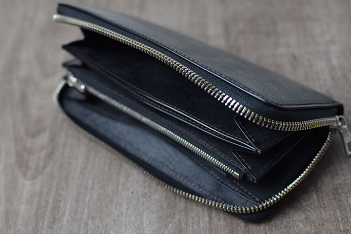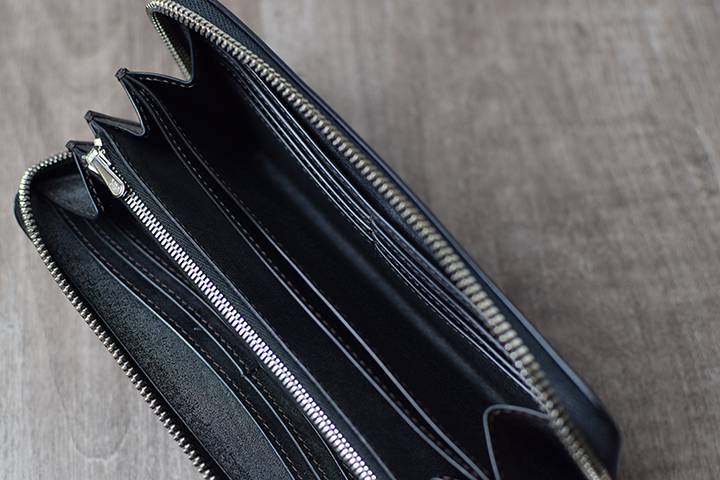 内装の中央にはファスナーがついた大容量のコインケースを備えています。両サイドにマチがついた構造によりコインケースの底までクリアに見ることができます。またこちらのコインケースは、パーツの底の部分と本体をあえて接続させない仕様となっています。こちらの仕様により、別の収納スペースにアクセスする際も可動域が広くなるため、中に収納したアイテムが取り出しやすく工夫されています。