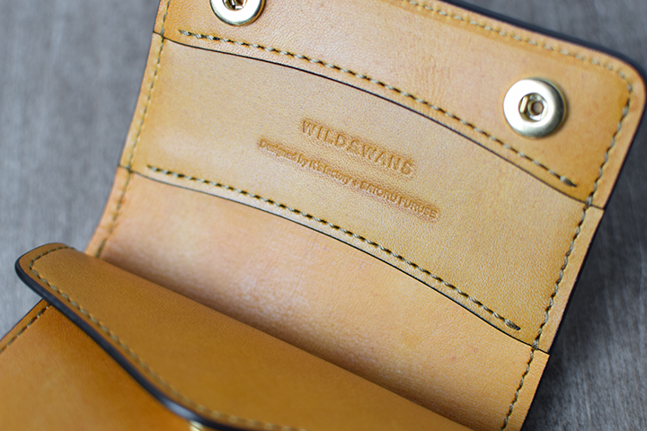 コインケースは両サイドにマチを設けているため、前胴部分を手前に引くと中身が見やすく、コイン等の取り出しがスムーズになります。また、コインケース内部にはWILDSWANSのアイテムでよく見られる革の仕切り「ベロパーツ」を装備しています。こちらの仕切りを利用することにより、コインに加え、カードもきれいに収めることができます。
