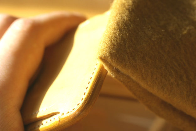 コバを乾拭きすると、色がナチュラルの製品のコバは木目のように美しく輝きます。殆ど木と言っても構わないくらいですが、ここから数年間使っていくと更に色艶の深みが増していき、本当に使い込んだ家具のような風合いに変わっていきます。