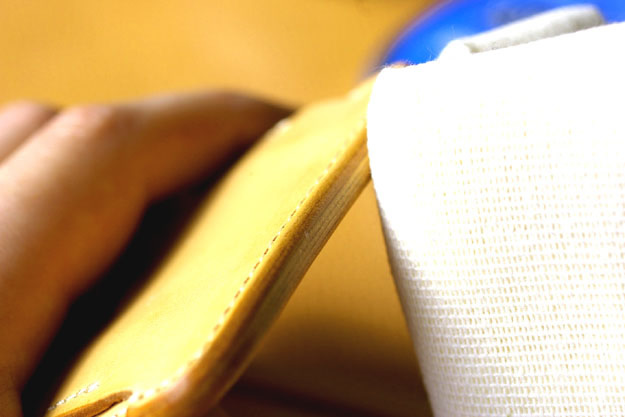 ここまでの作業である程度修復されてはいますが、仕上げとして柔らかい布で乾拭きをします。基本的にはオイルやクリームの塗布の必要はありませんが、塗っておくとツヤが上がり見た目も綺麗になりますし、より長持ちします。