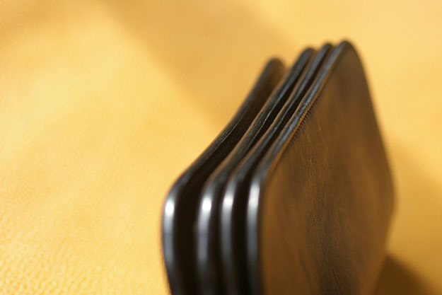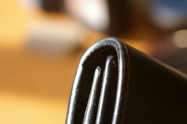 お財布などの折れ曲がる部分はコバが薄くなっているので、このような部分はスリッカーをかけずにクリームのみの処理の方が良いでしょう。日常的に最も駆使する部分でもありますので、少し染料が退色している可能性があります。このような箇所は黒い色付きのクリームの方が補色も兼ねてケア出来ます。