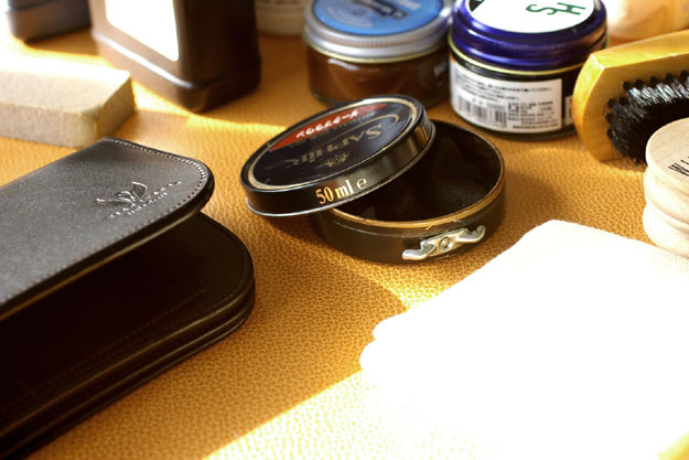 黒い染料を入れて磨いてあるコバに対して無色のクリームを使用しても問題はありませんが、使い込んだことによりコバの色が少し薄くなっている場合は、補色も兼ねて黒い色付きのクリームをお進めします。(こちらもシューケア用品を扱っている所の、蝋と油脂が入っている一般的な皮革靴用のクリームで構いません。)